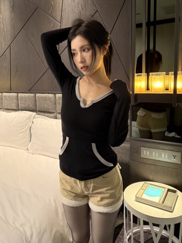 T01 疊穿日常拼色連帽棉tee 黑