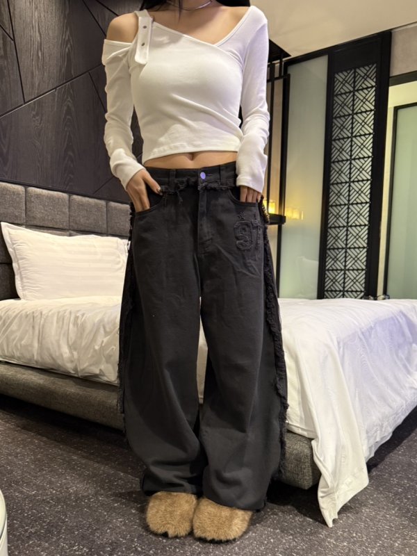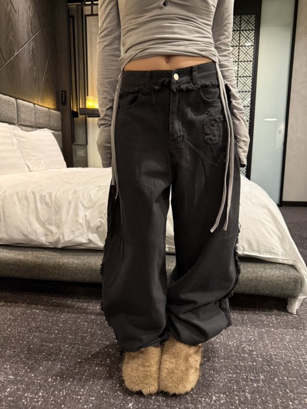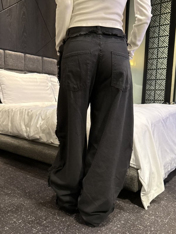 T04 本期命中款!高腰作弊抽鬚設計彎刀褲 黑