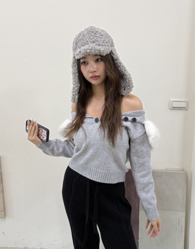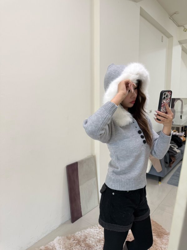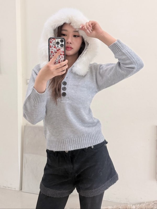 《現貨》T01 針織連帽辣妹排扣衣 毛毛可拆 灰