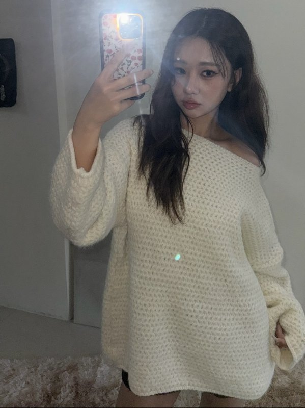 《現貨》T05 寬鬆可露肩厚實慵懶毛衣 米白