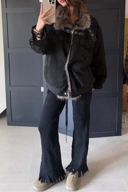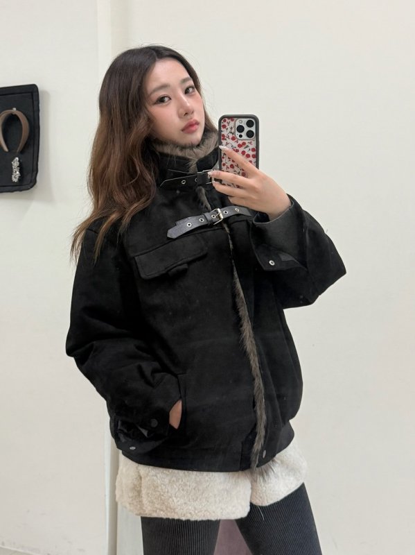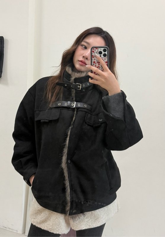 《現貨》T09 立領皮革釦加絨水貂毛夾克外套 黑