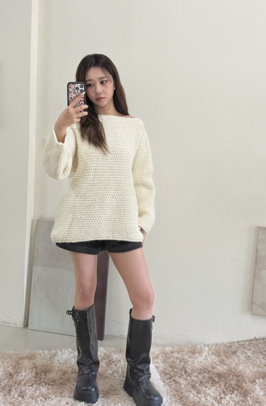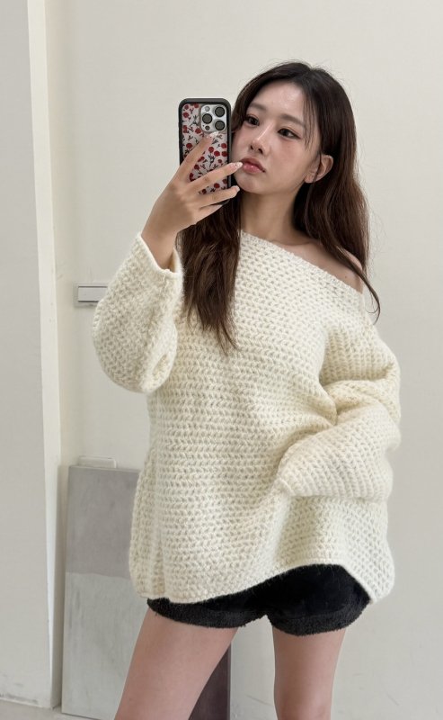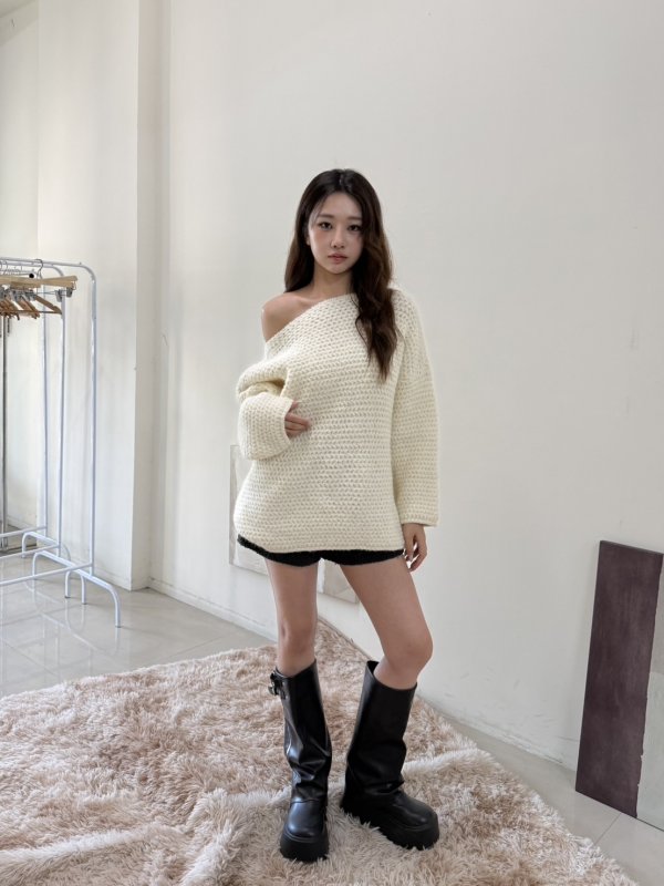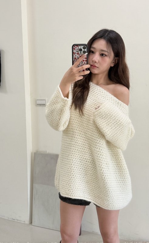 《現貨》T05 寬鬆可露肩厚實慵懶毛衣 米白