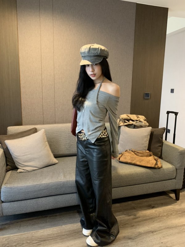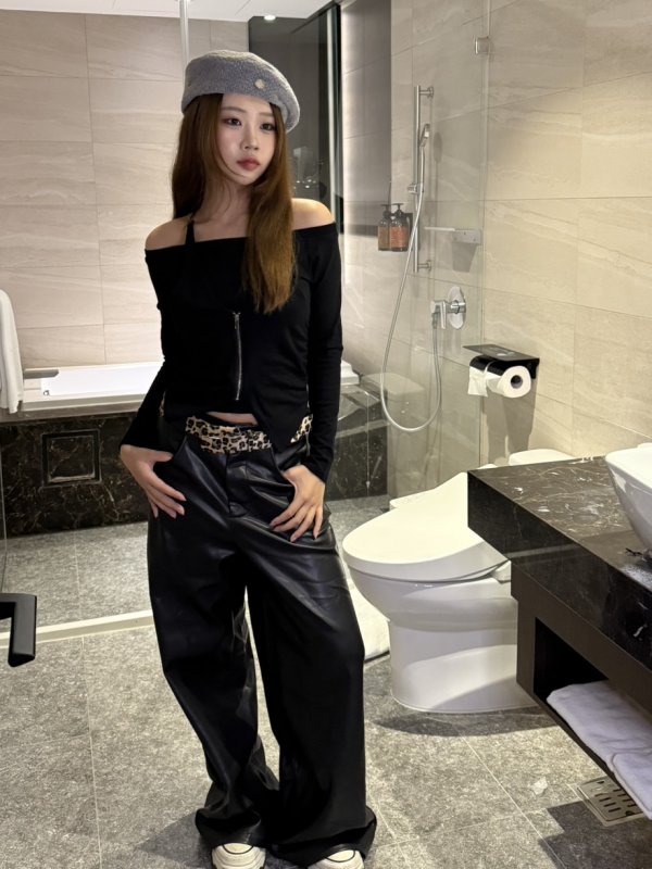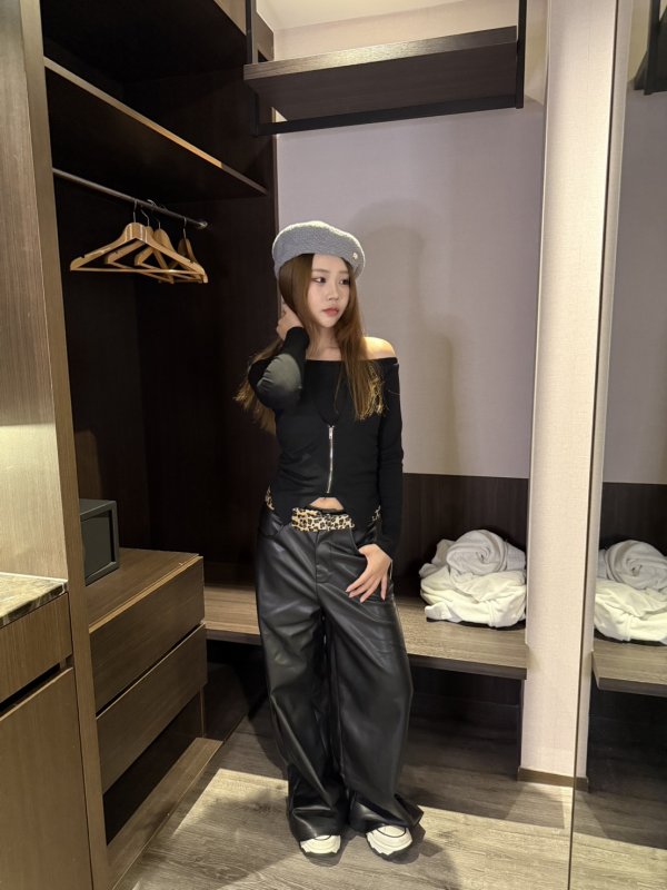 Oc43 Dream fit寬鬆舒服滑面皮長褲+贈絨布豹紋皮帶 黑