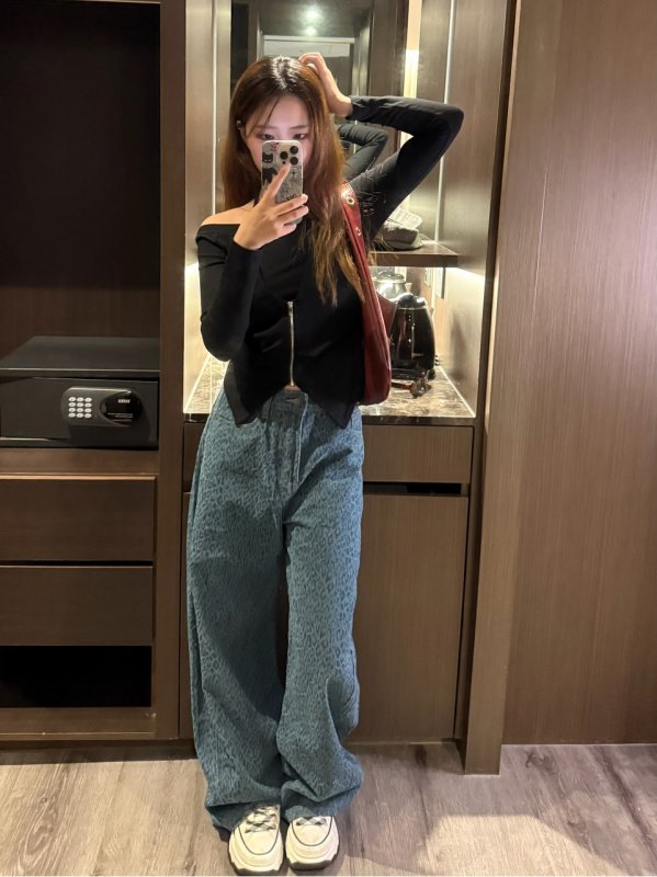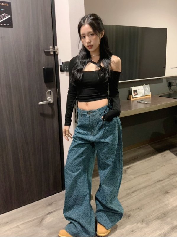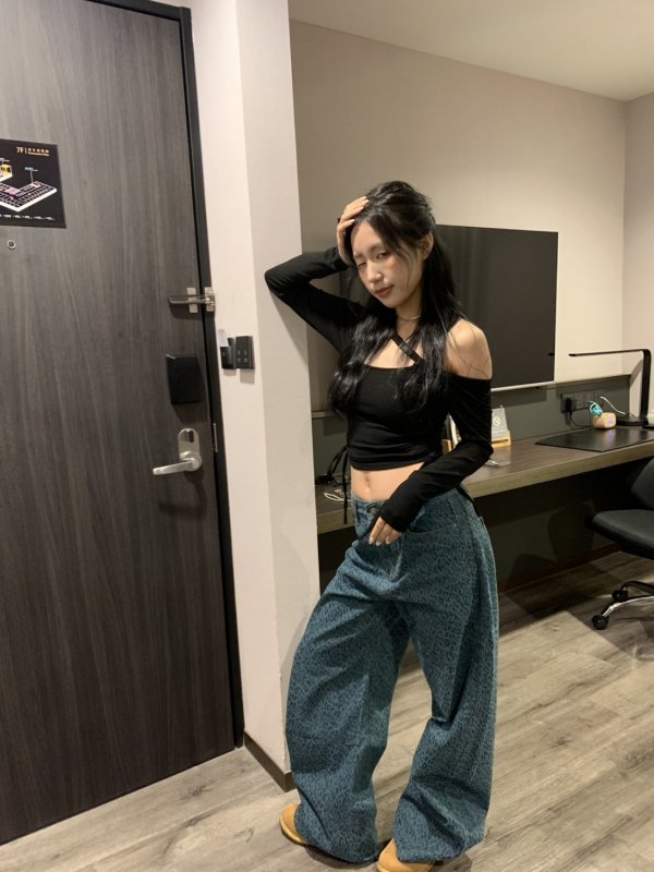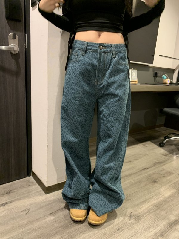 Oc51 滿版豹紋廠商自訂款寬鬆牛仔褲 孔雀藍