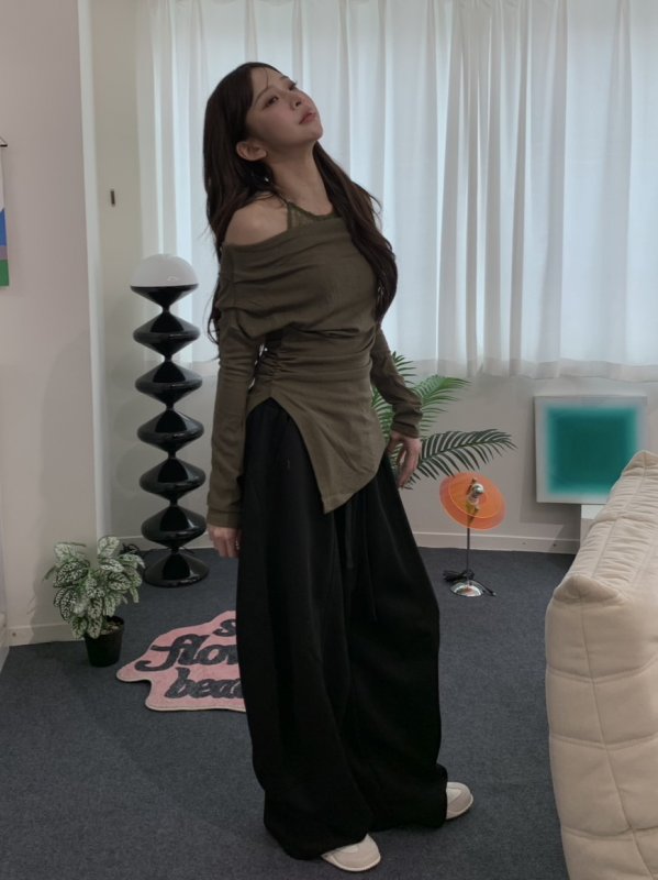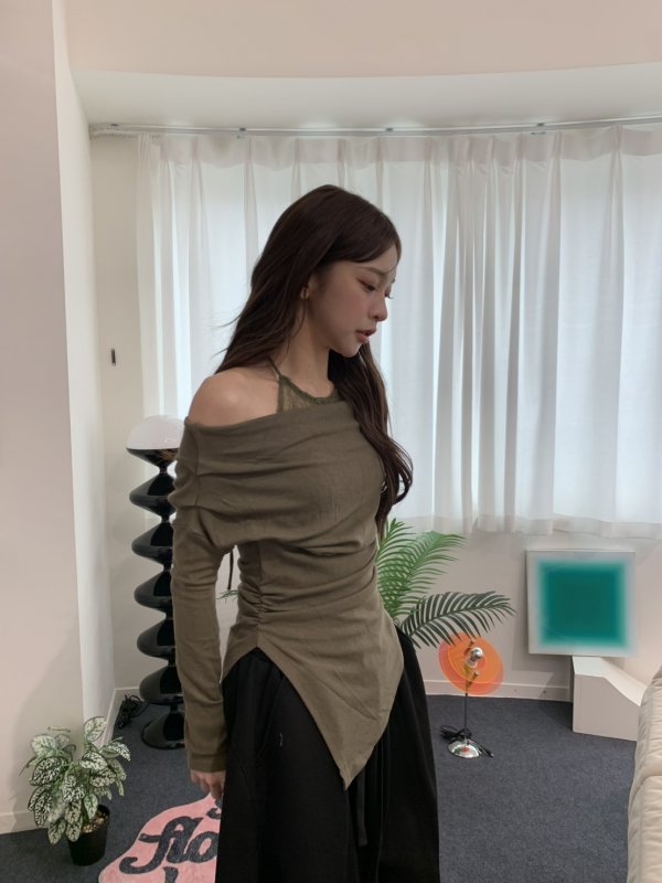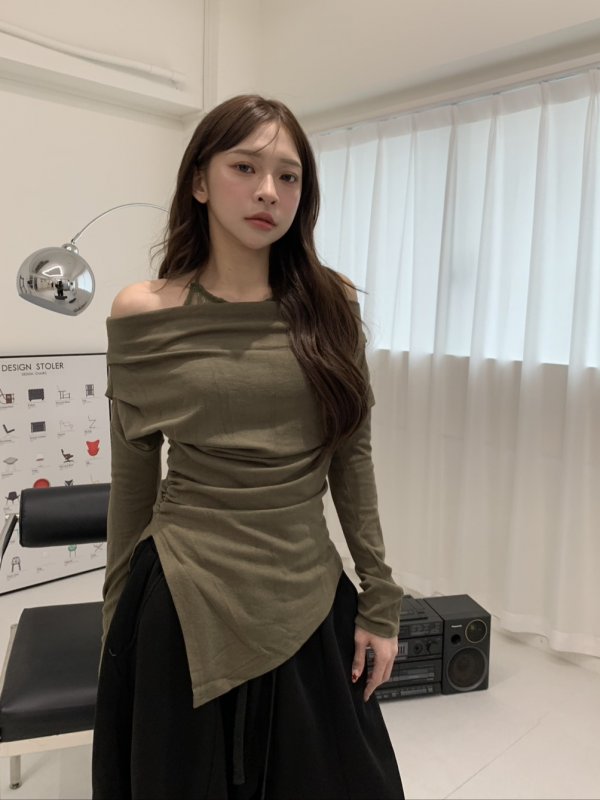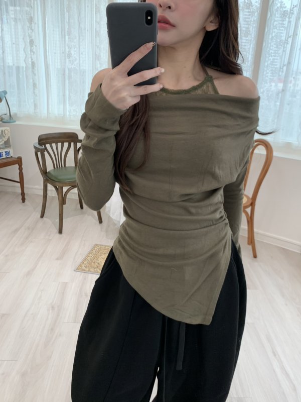 V04 本期命中款!蕾絲設計假兩件繞脖收腰棉tee 綠