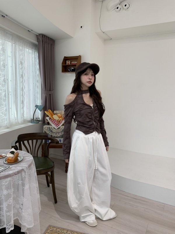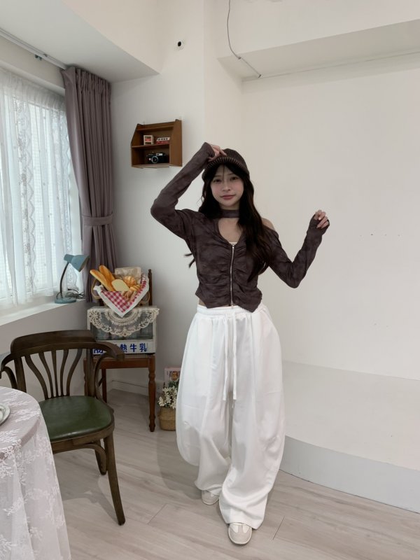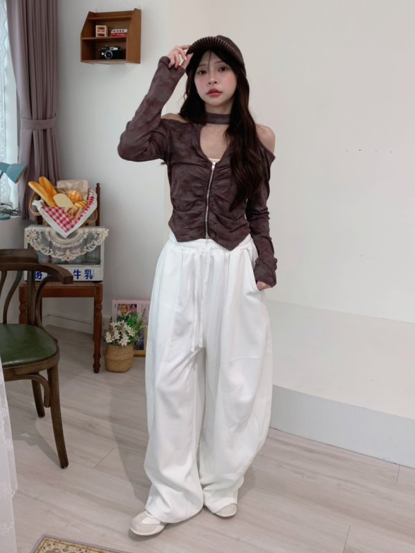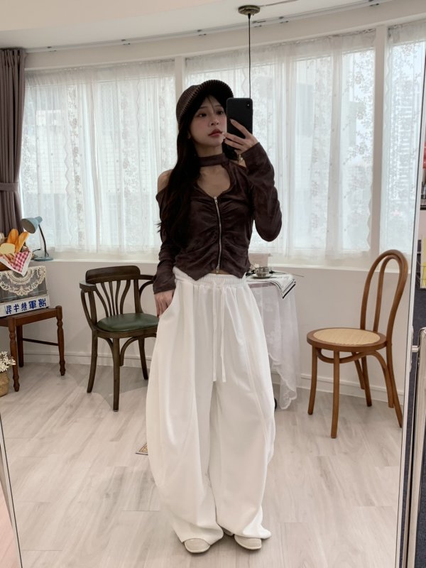 V06 氣球闊腿重膀設計鬆緊棉褲 白