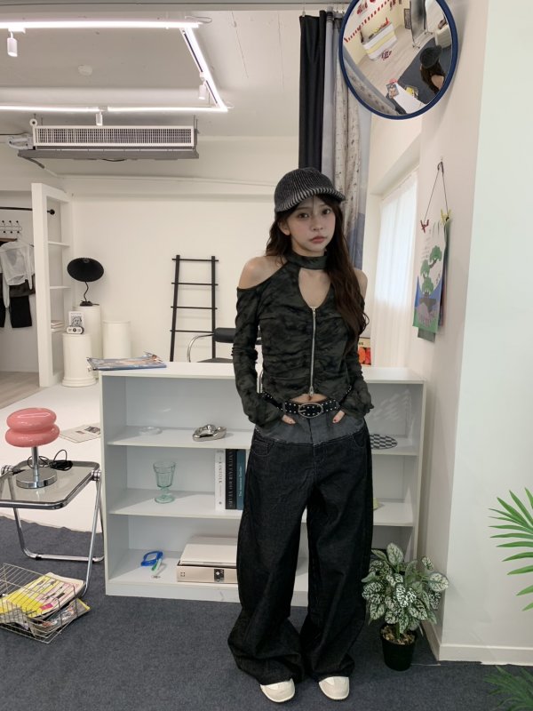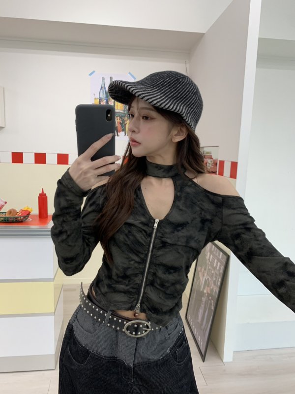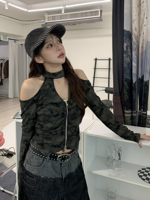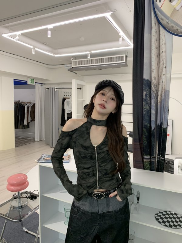 V07 暈染挖肩設計雙拉鍊棉tee 黑