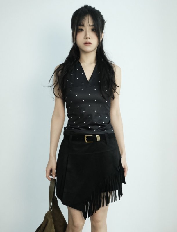 N43 美式流蘇麂皮不規則短裙(贈皮帶)黑