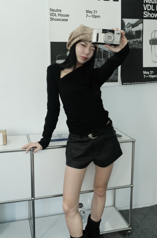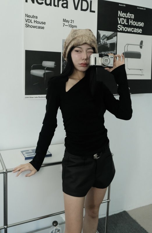 N44 本期命中款!冬日辣妹內刷毛斜切棉tee 黑