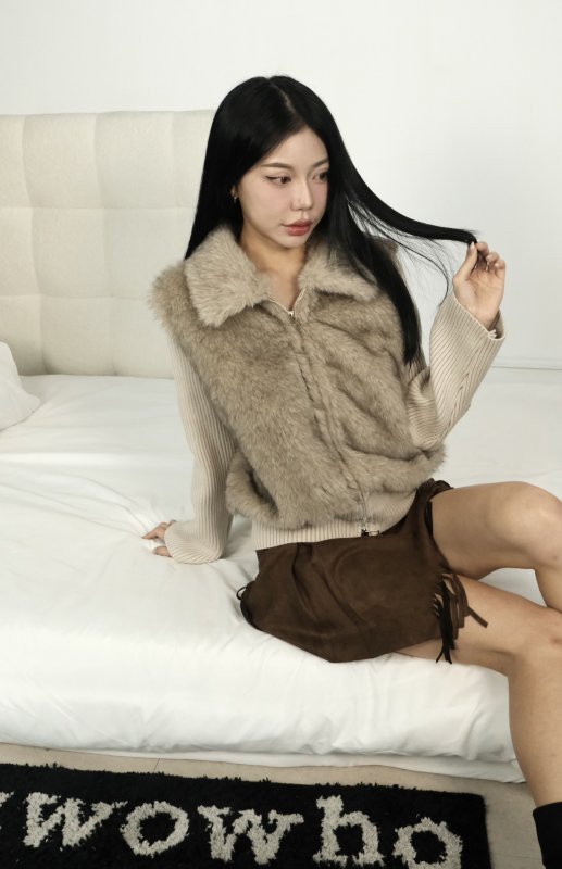 N53 名媛精緻拼接毛絨針織外套 卡其
