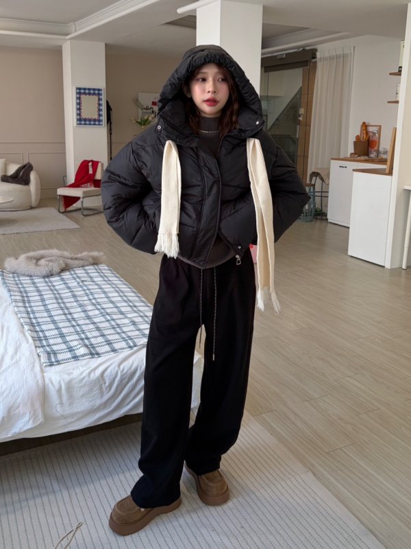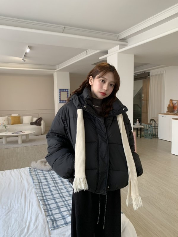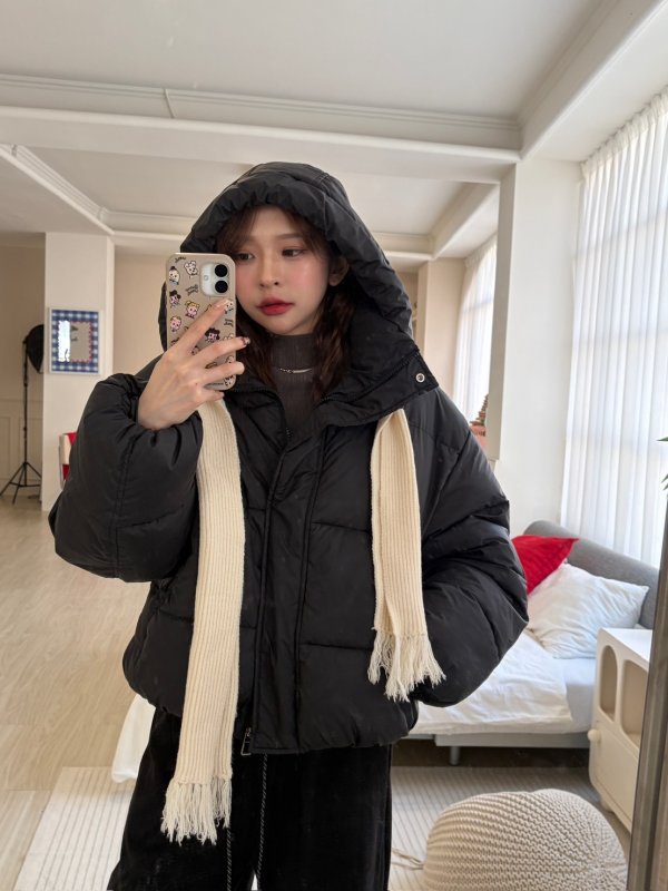 O24 雪地連帽鋪棉外套 贈圍巾 黑
