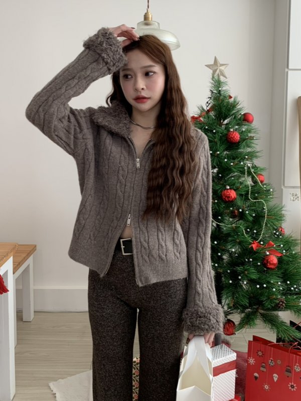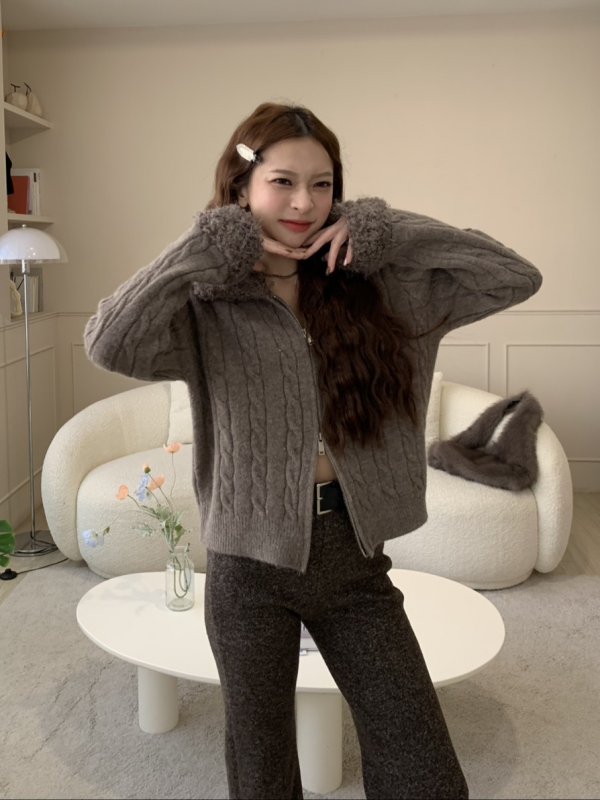 O34 本期命中款!高檔口翻領羊羔毛雙拉鍊針織衫 灰咖