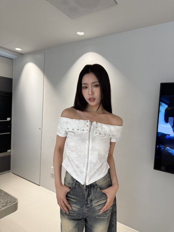 A70 本期命中款! 暈染一字領彈力拉鍊短T 白