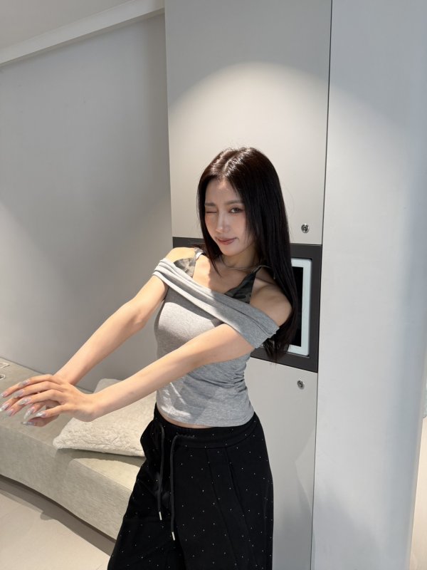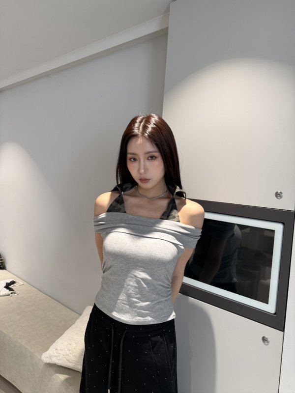 A73 本期命中款! 迷彩掛脖一字領抓皺T 灰