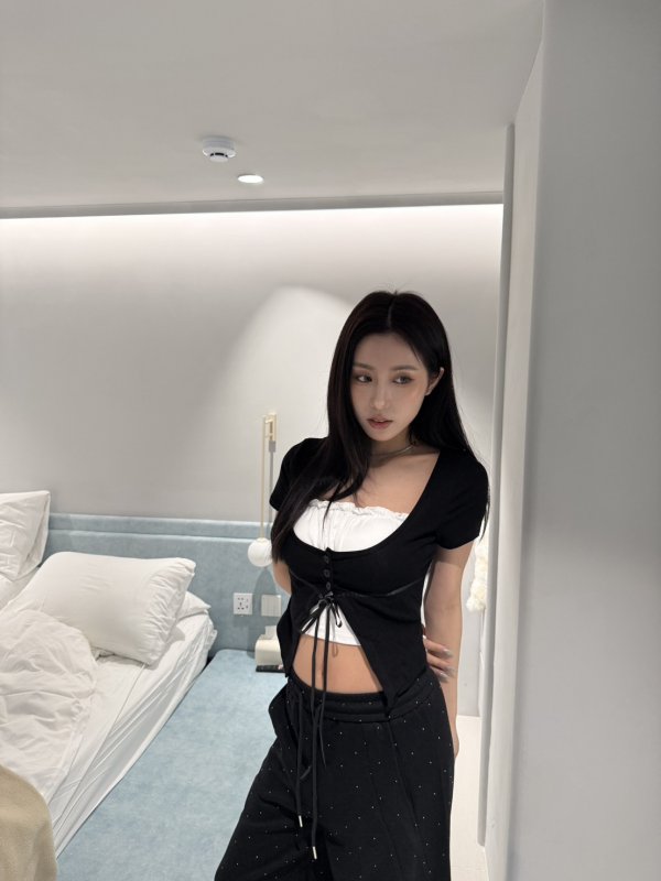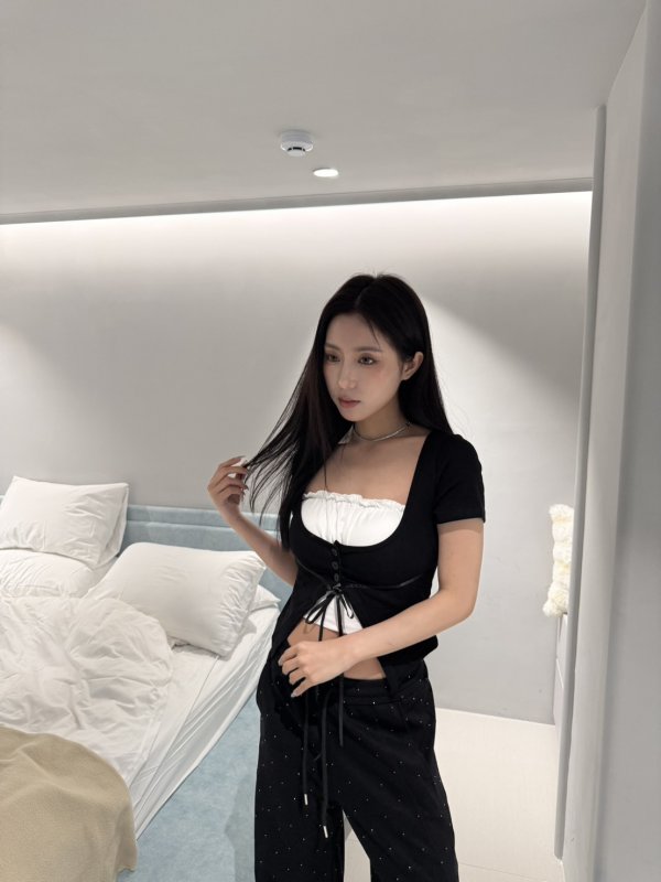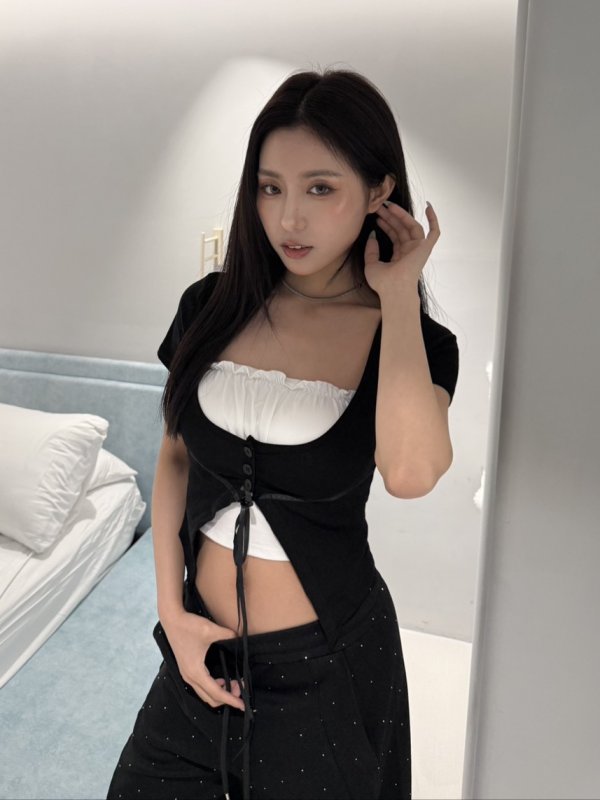 A89 排扣緞帶2件式胸墊韓妞短T 黑
