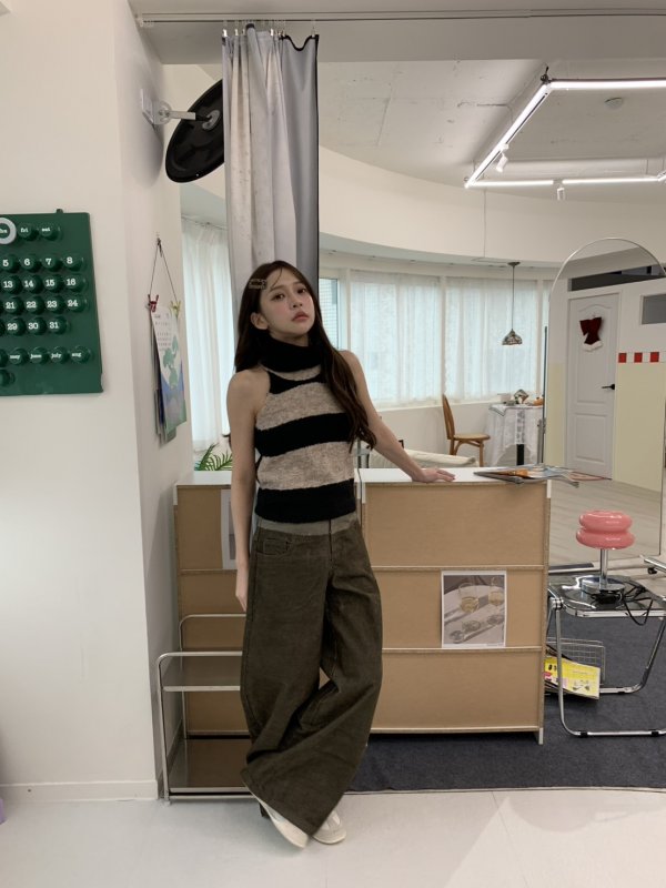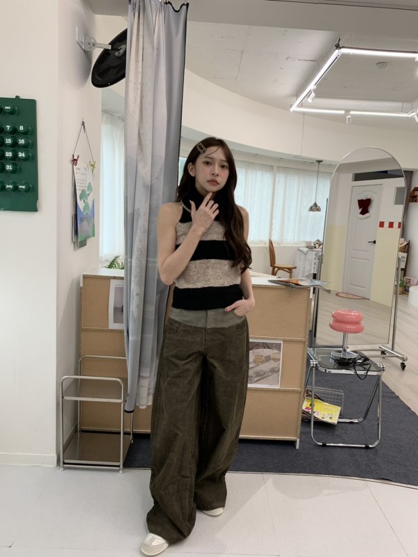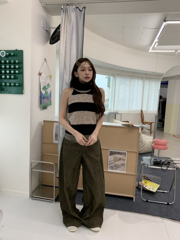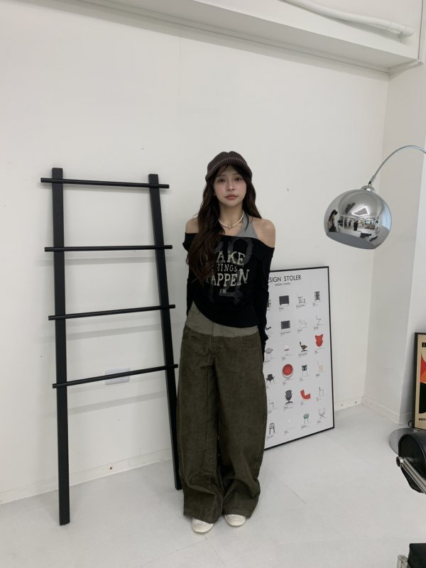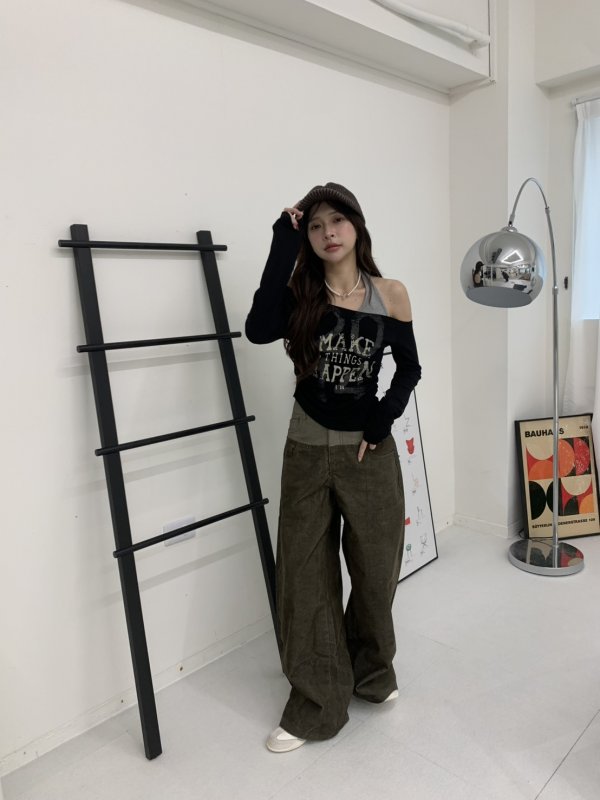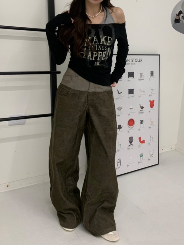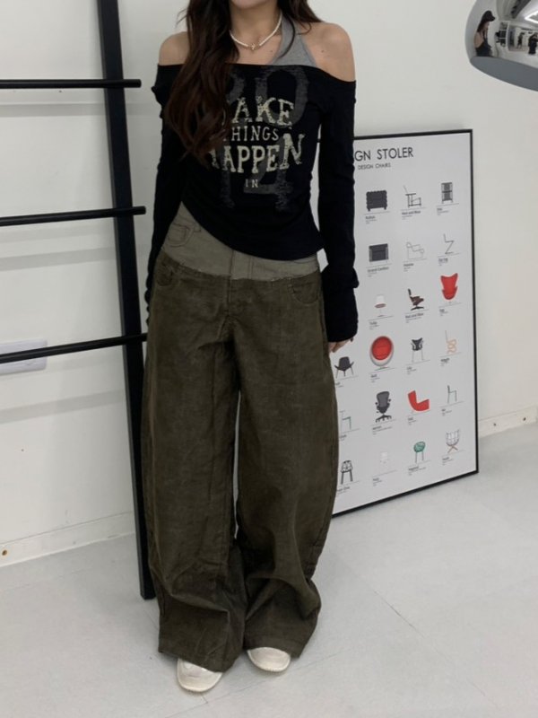 V02 本期命中款!貓鬚水洗拼接車邊燈芯絨寬褲 卡其綠