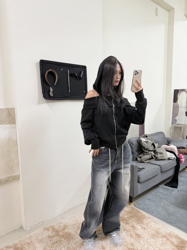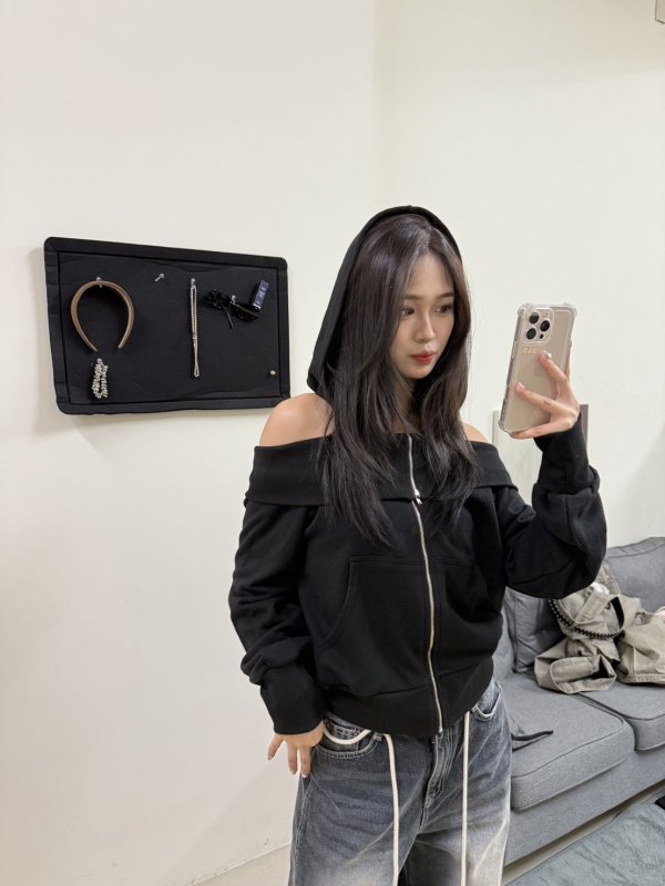 N12 本期命中款!鏡頭王一字領衛衣拉鍊大帽tee 黑