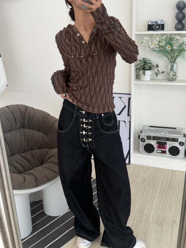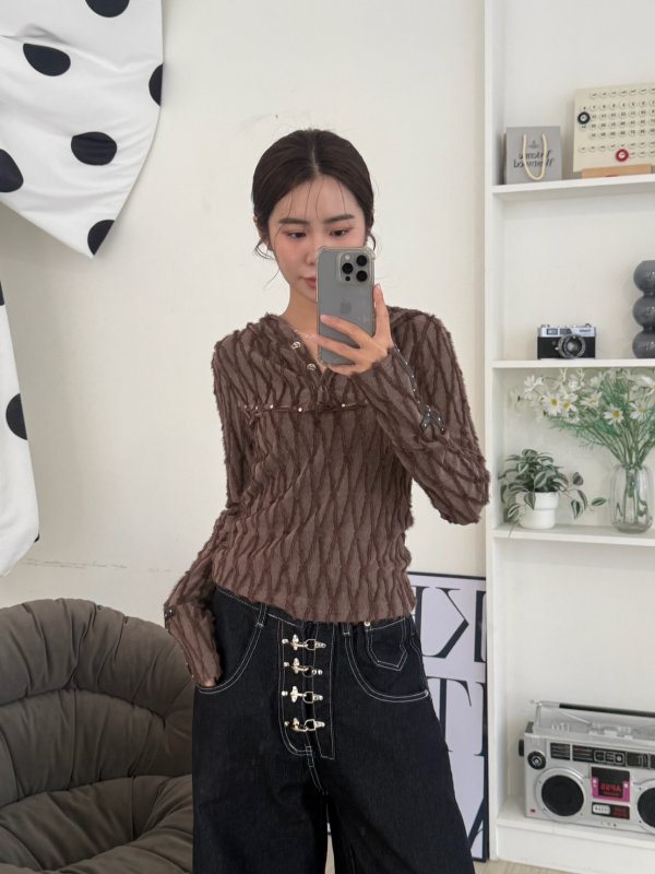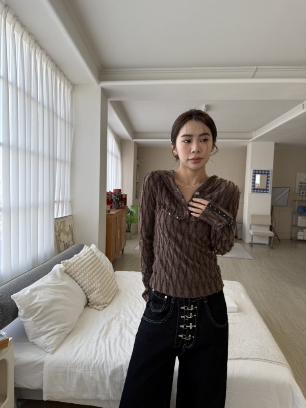 J19本期命中款!紋理毛邊設計連帽排扣T 咖色