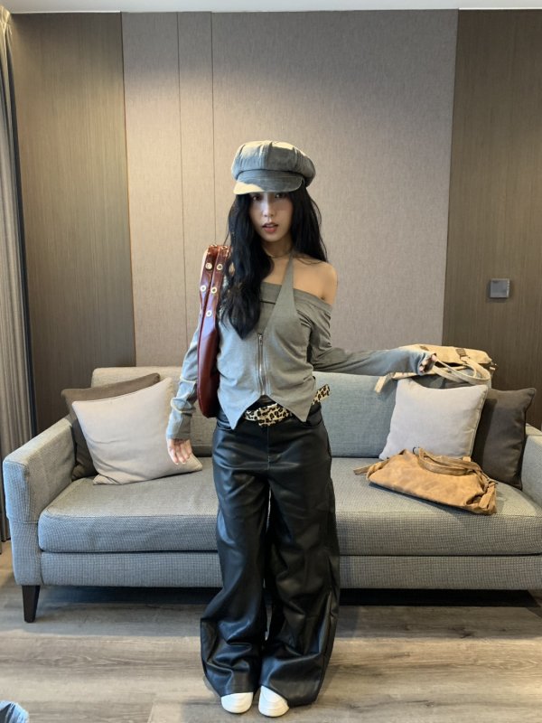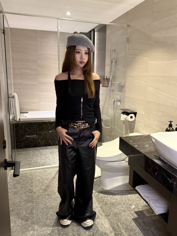 Oc43 Dream fit寬鬆舒服滑面皮長褲+贈絨布豹紋皮帶 黑