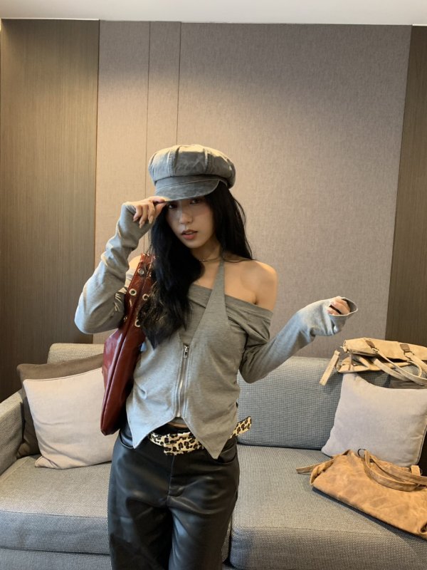 Oc50 本期命中款!做舊字母v領排扣彈力墊肩酷tee 灰