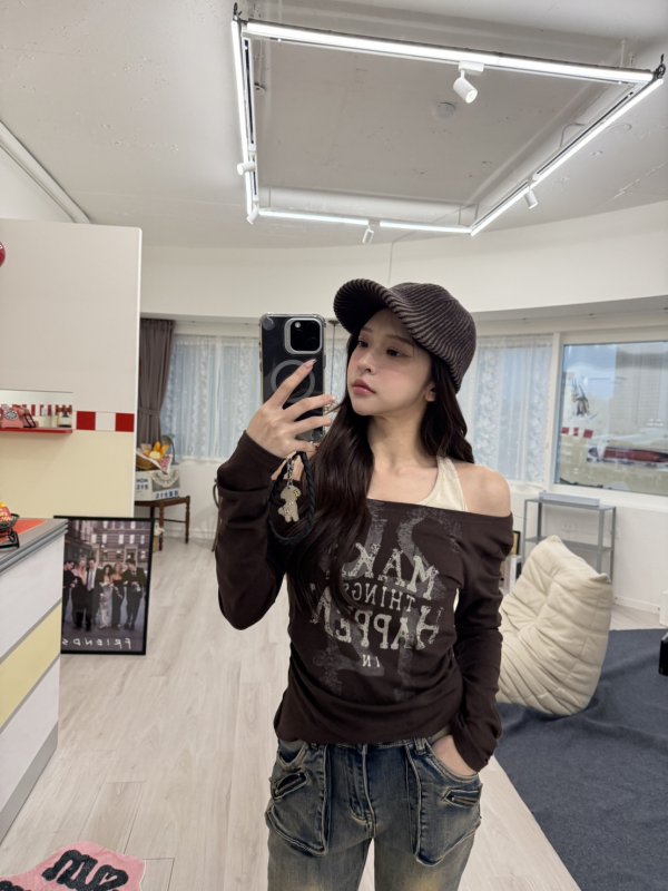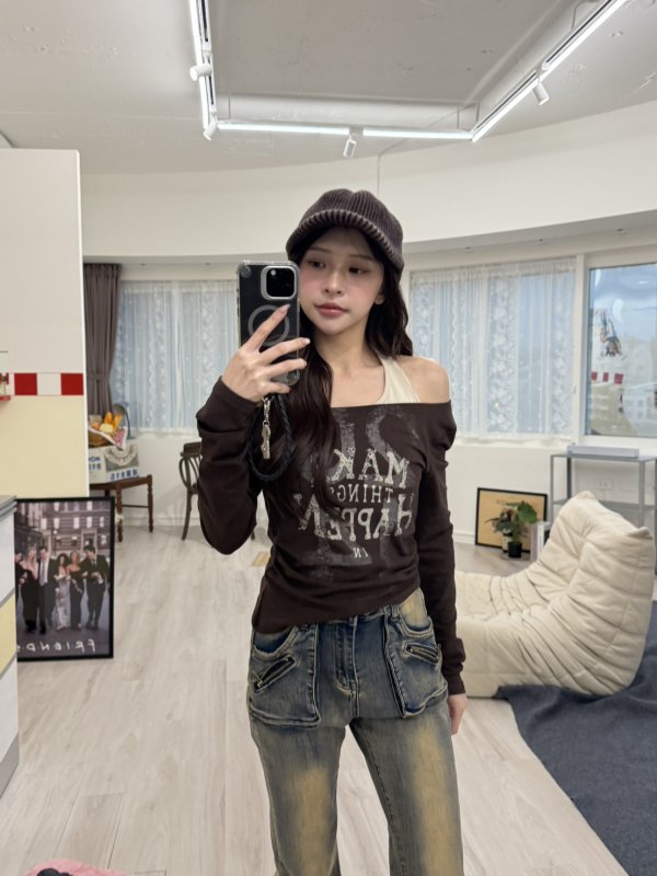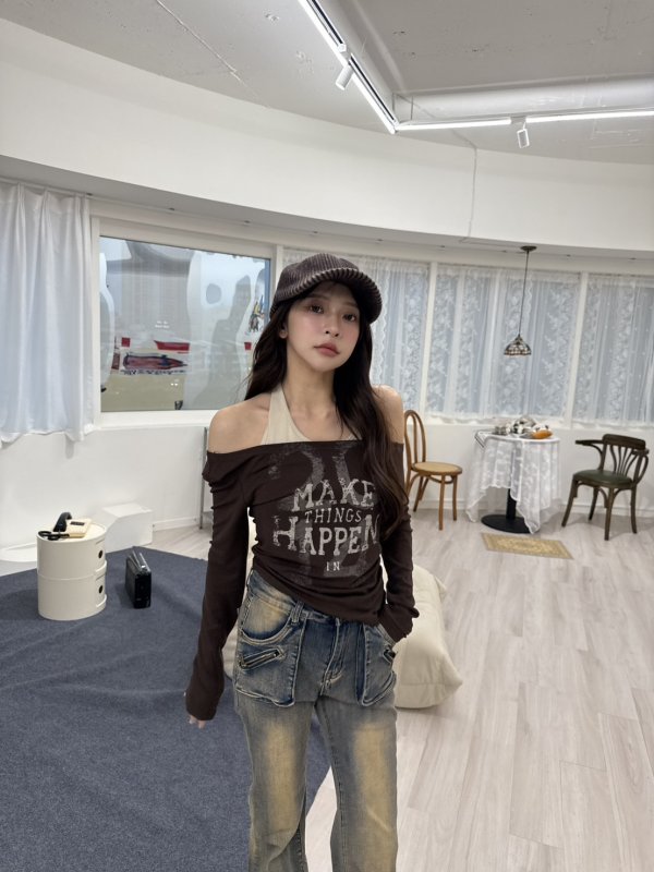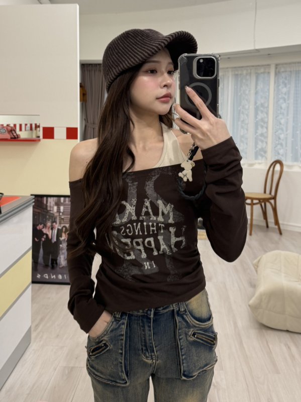 V11 本期命中款!港風圖騰假兩件掛脖棉tee 咖