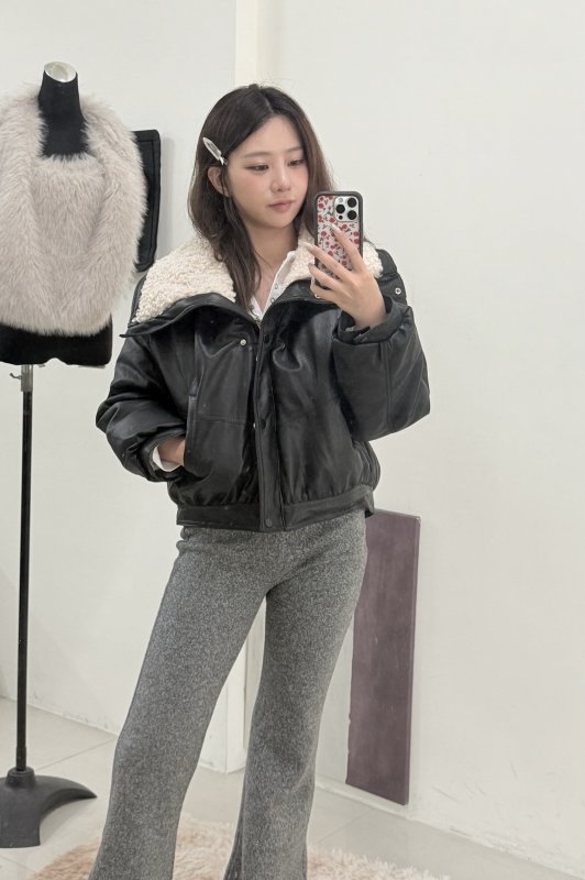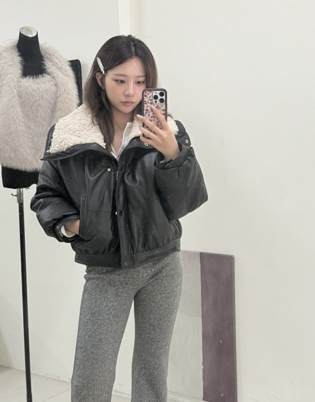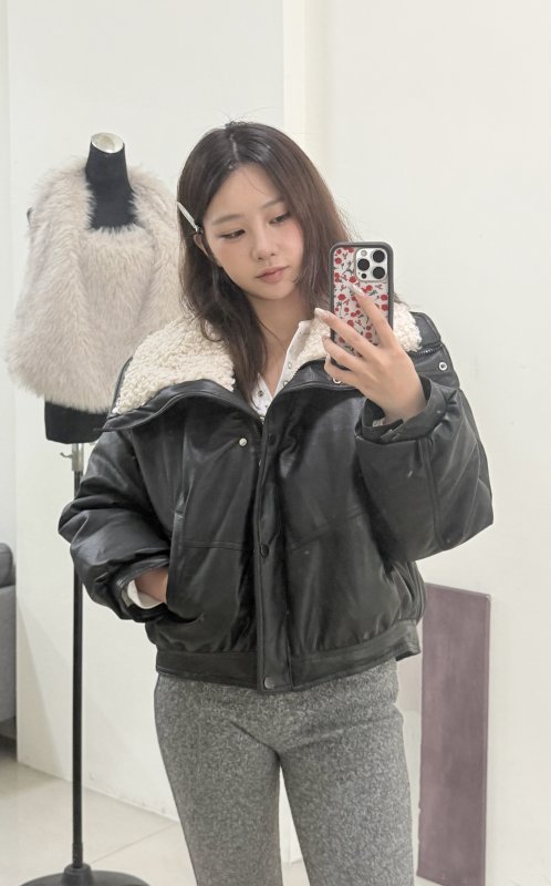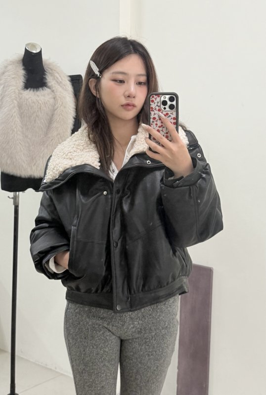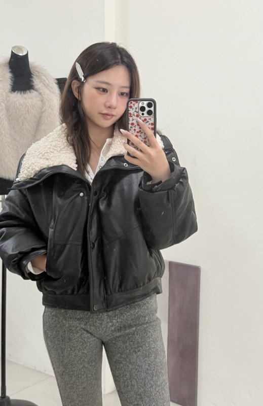 O32 本期命中款!翻領保暖皮革鋪棉外套 黑