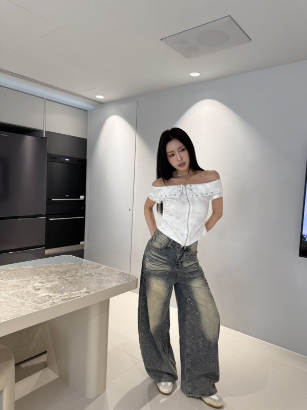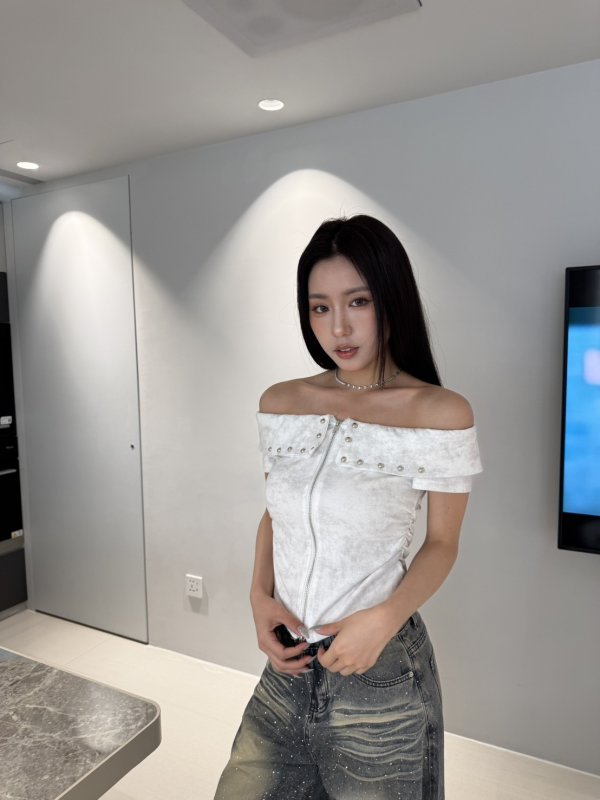 A70 本期命中款! 暈染一字領彈力拉鍊短T 白