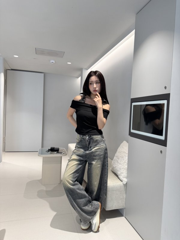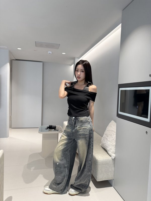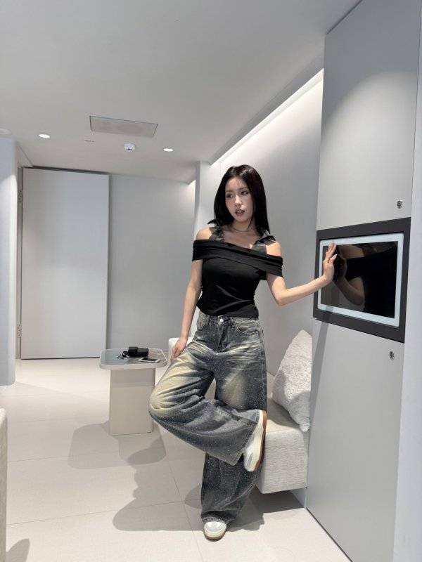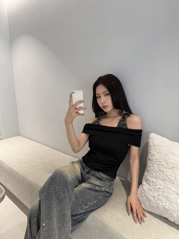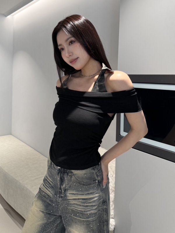 A73 本期命中款! 迷彩掛脖一字領抓皺T 黑